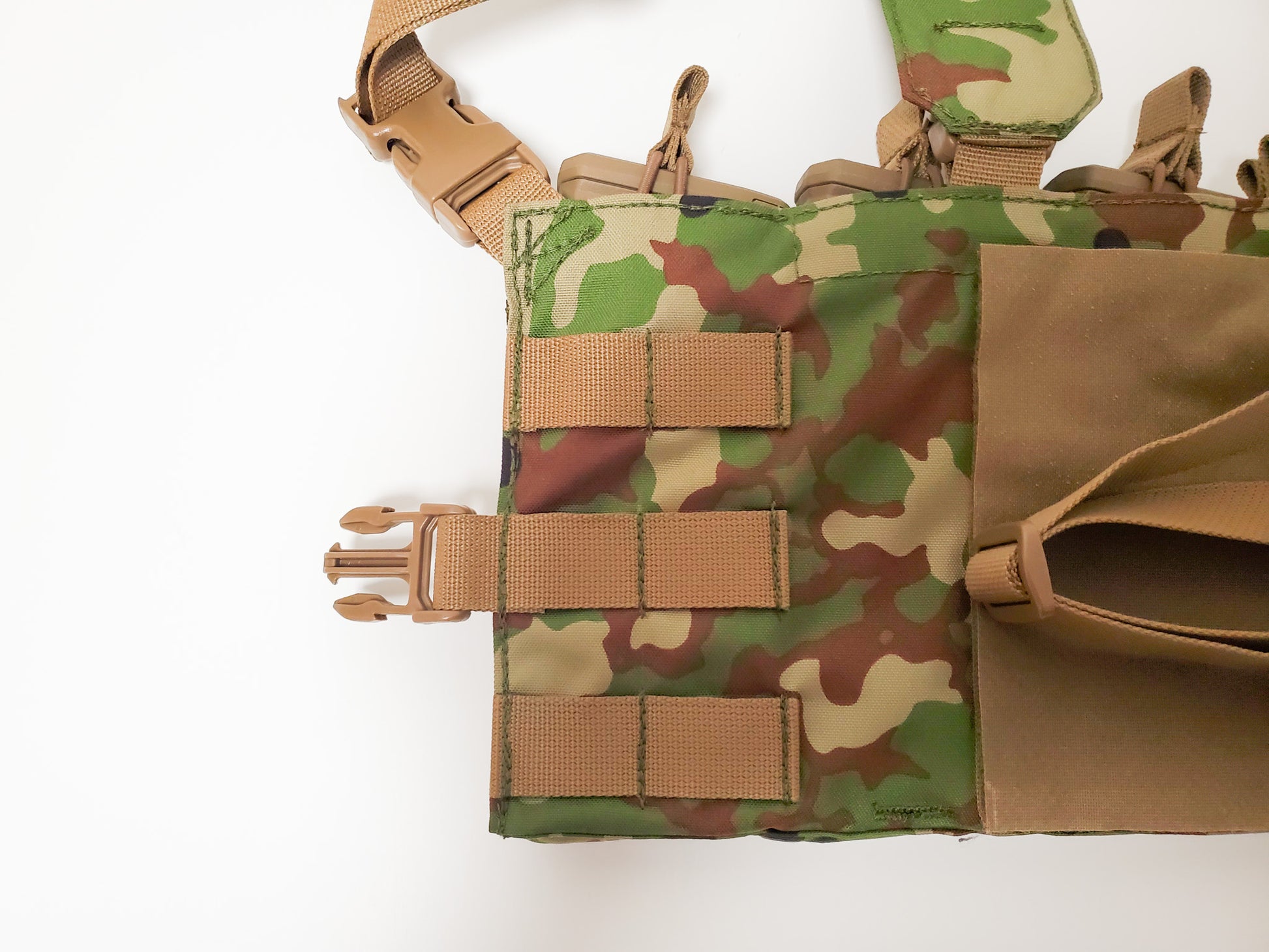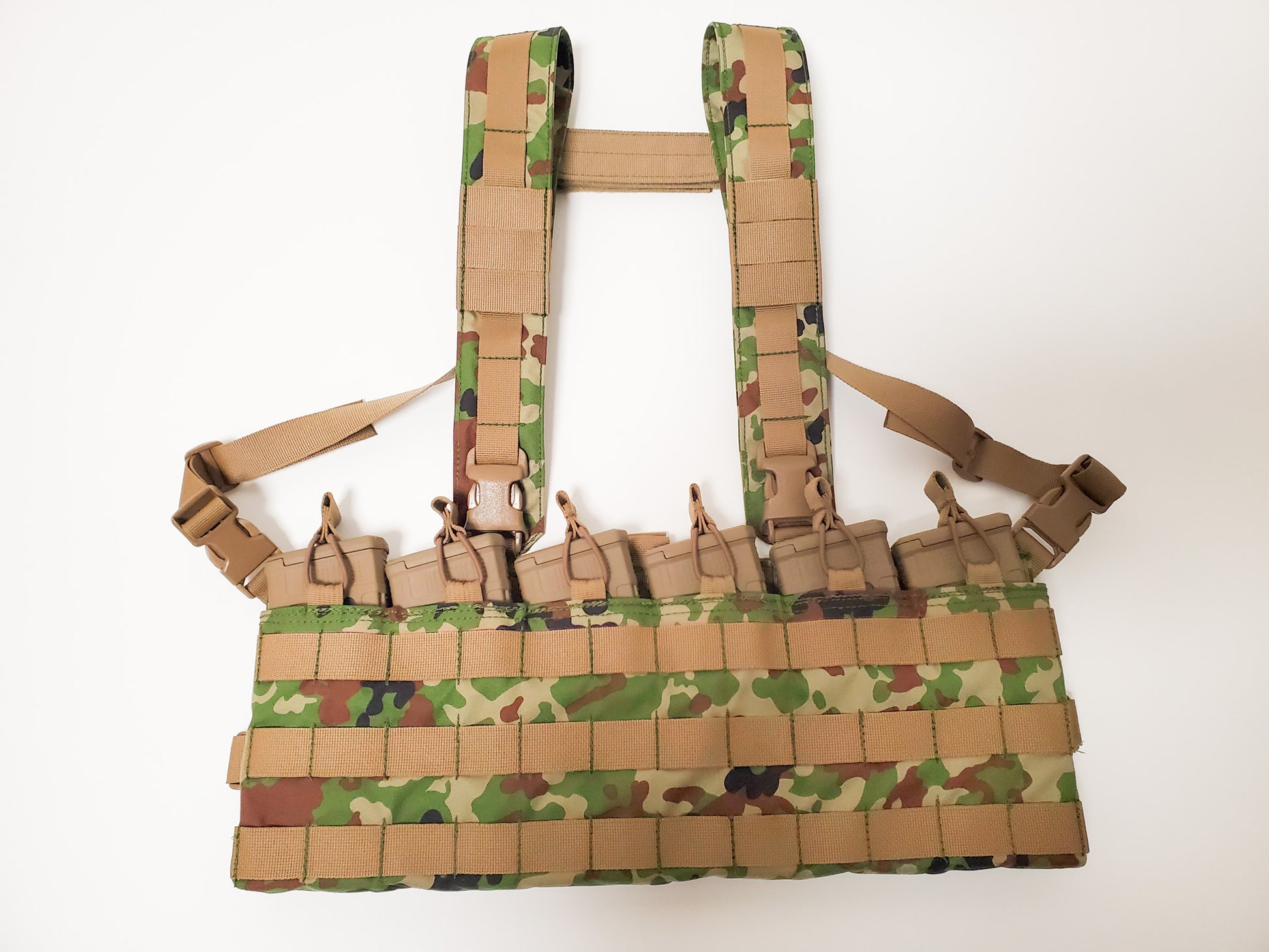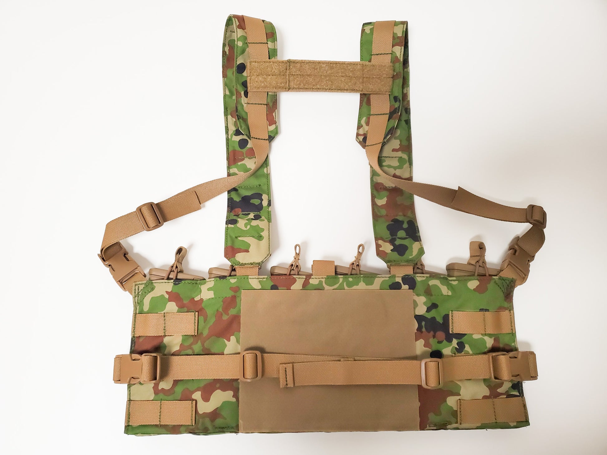 当方で作成している8弾倉チェストリグを、6弾倉用として再設計したモデルです。お客様のご要望で、パネルのサイドから出ているバックルは通常のモデルと逆にしております。