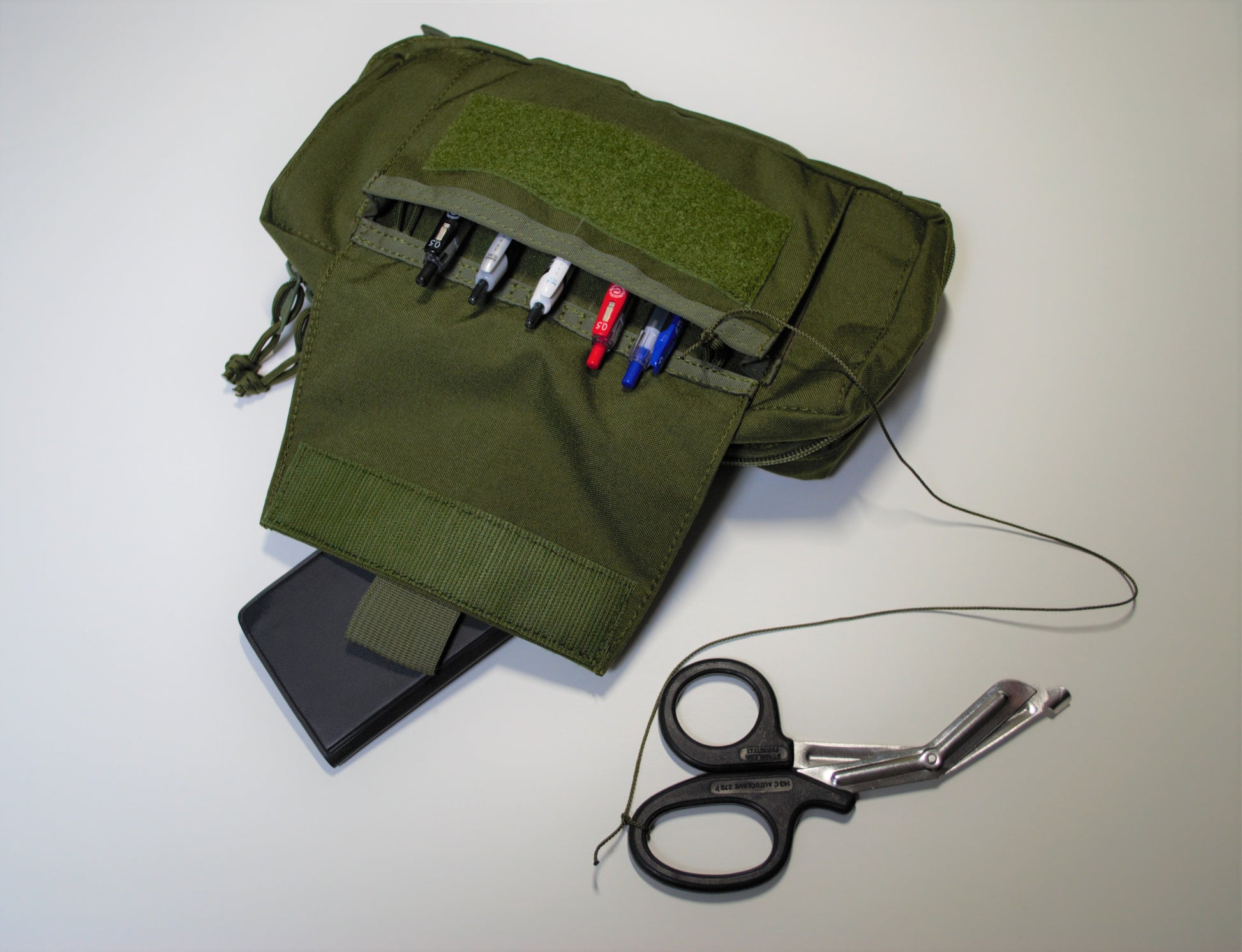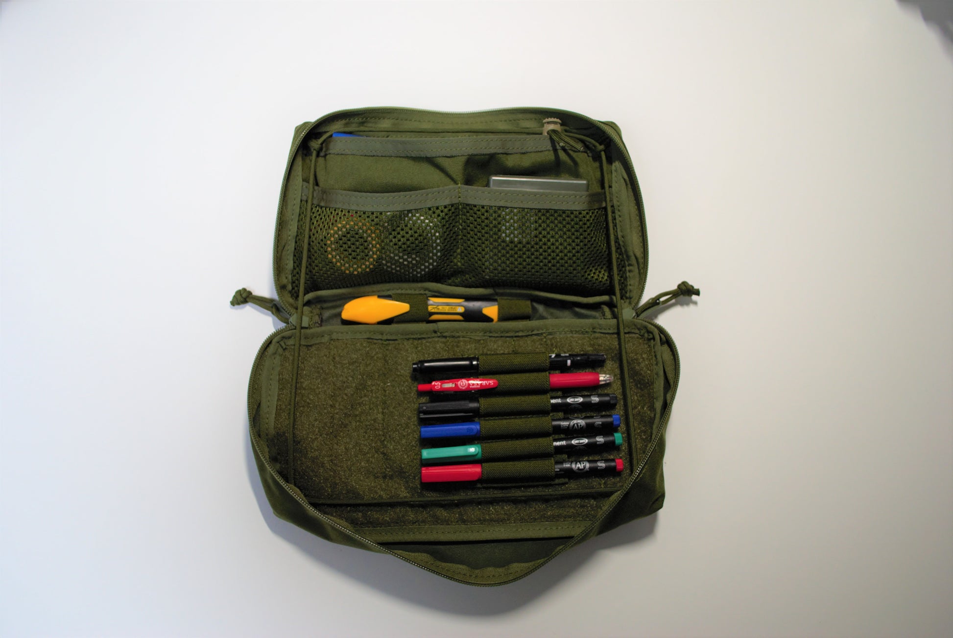 測量、観測、射撃、射撃指揮など、砲兵の多岐にわたる任務では多数の文房具や測量具を使います。それらの砲兵(特科隊員)に必需品である小物をコンパクトに胸部でまとめておくためのアドミンポーチです。