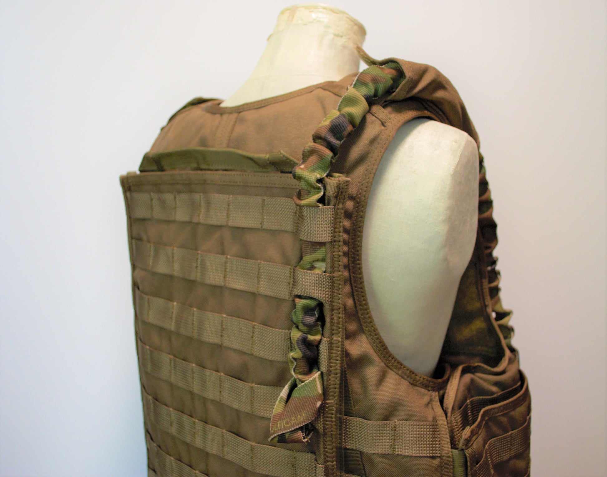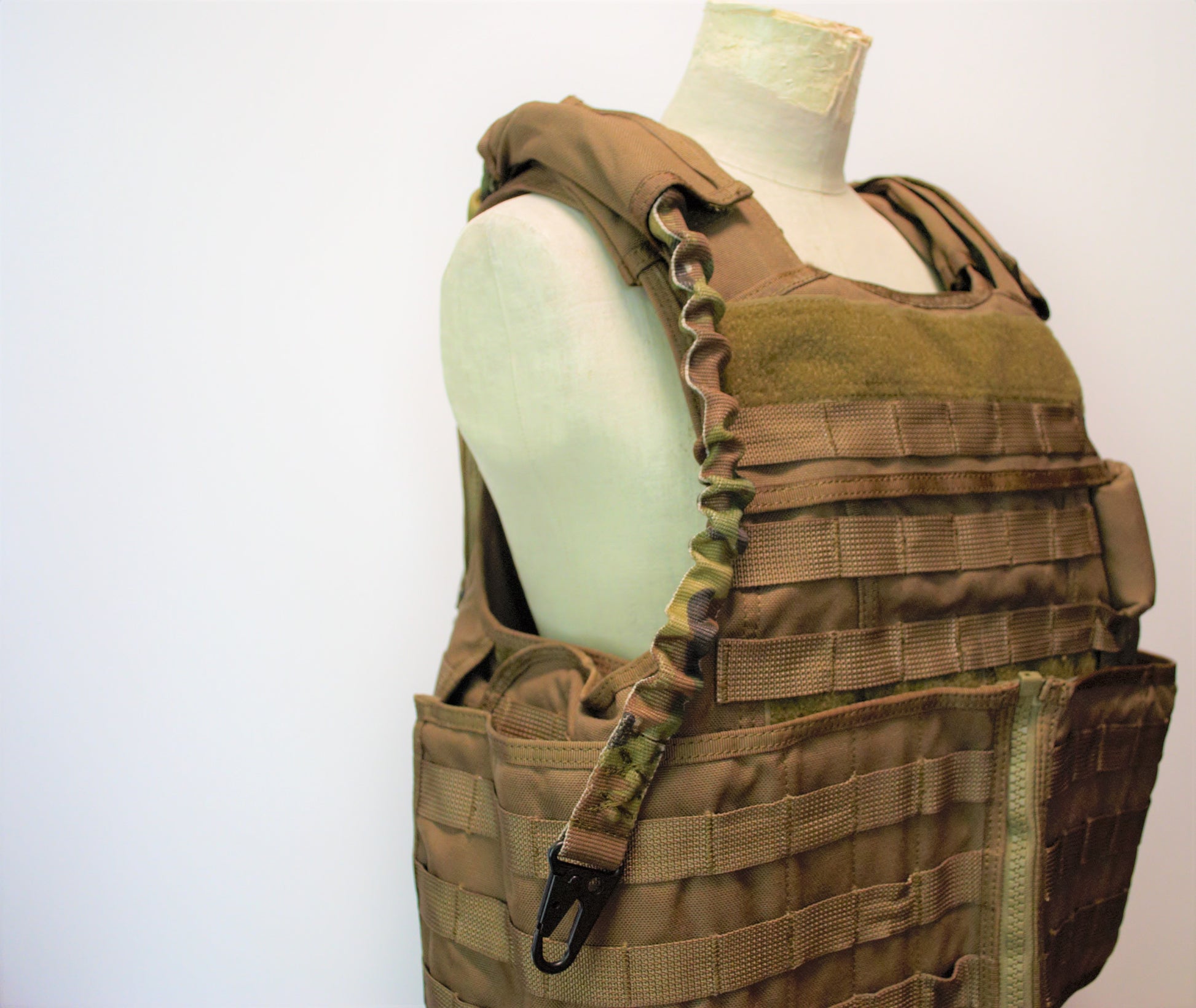 通常のスリングと同様にライフルスリングとしてもご利用いただけると思いますが、当製品はプレートキャリア背面のMOLLEにループ側を装着し、ショルダーパッド内を経由して腰あたりにブリーチングショットガンを吊るサブスリングとして考案いたしました。
