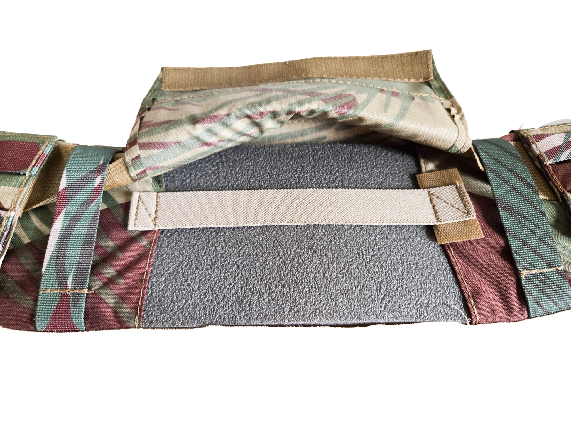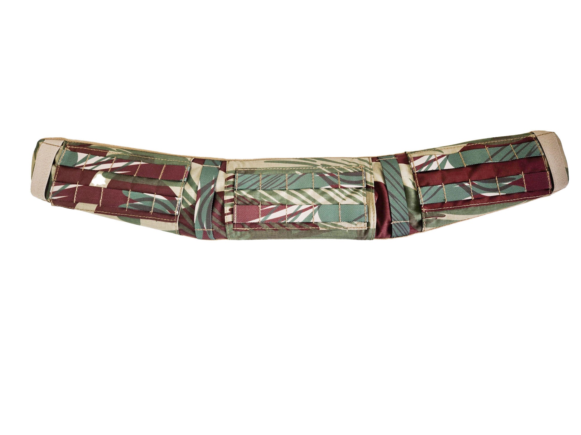 横5コマ×縦2コマのMOLLEベースを3カ所に配置した、ベルトパッドです。写真に写っているインナーベルトは付属しませんので、お手持ちのベルトを入れてお使いください。