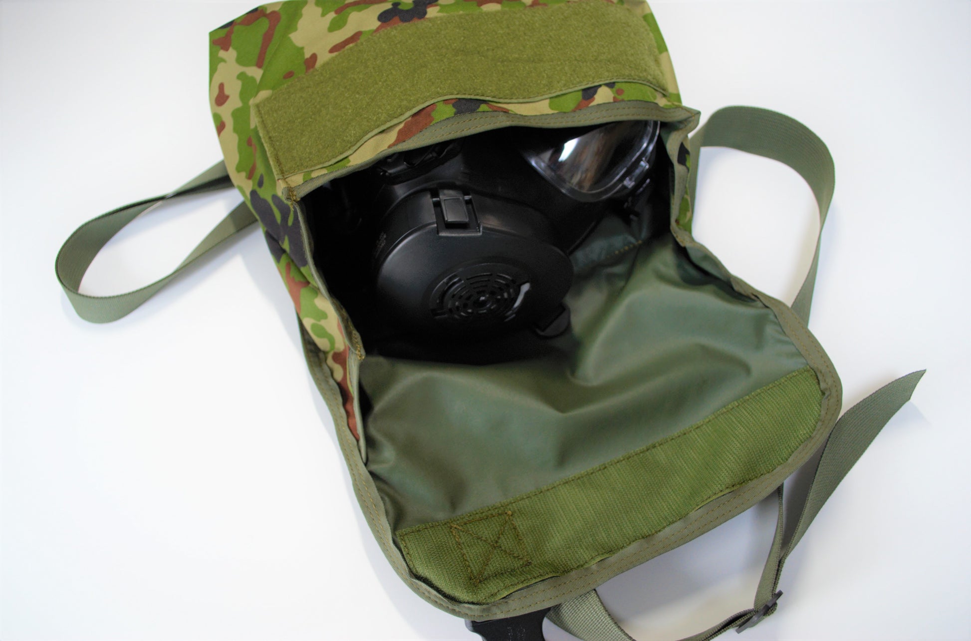 本邦陸上自衛隊では、防護マスクを肩掛けカバン方式で携行できるようになっています。あるいは、創意工夫をして弾帯に直接カラビナなどで固定することもできるでしょう。