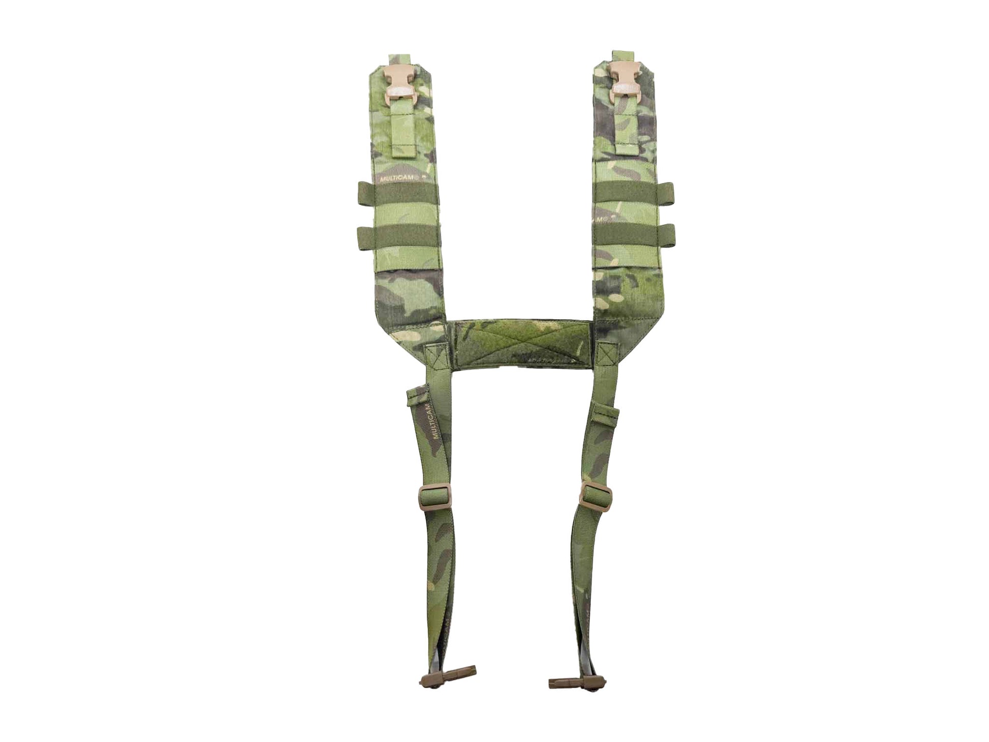 当店でお作りしているチェストリグのほか、多種多様なチェストリグにお使いいただけるハーネスです。2way Paradise Jungle Harnessと同様のデザインですが、2㎝ほど幅を広くもち、肩に当たる部分に5㎜厚のクッションを入れた重量運搬向けのハーネスです。
