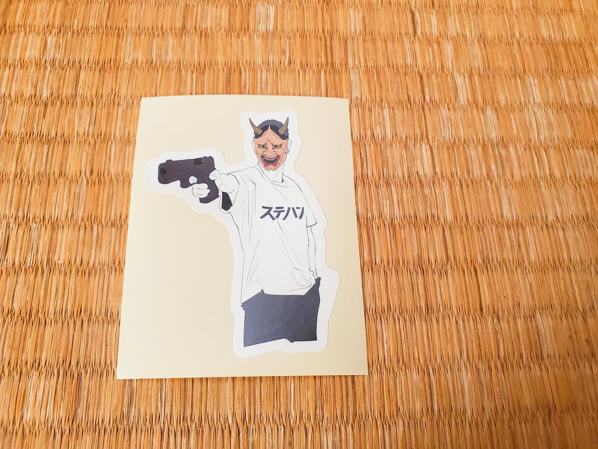 さて、このステッカーは、そんな伝統芸能「能楽」に用いられる「面」をかぶせた某おじさんを表現いたしました。面は、若い女性を現した「小面」と嫉妬に狂う女性を現した「般若」があります。