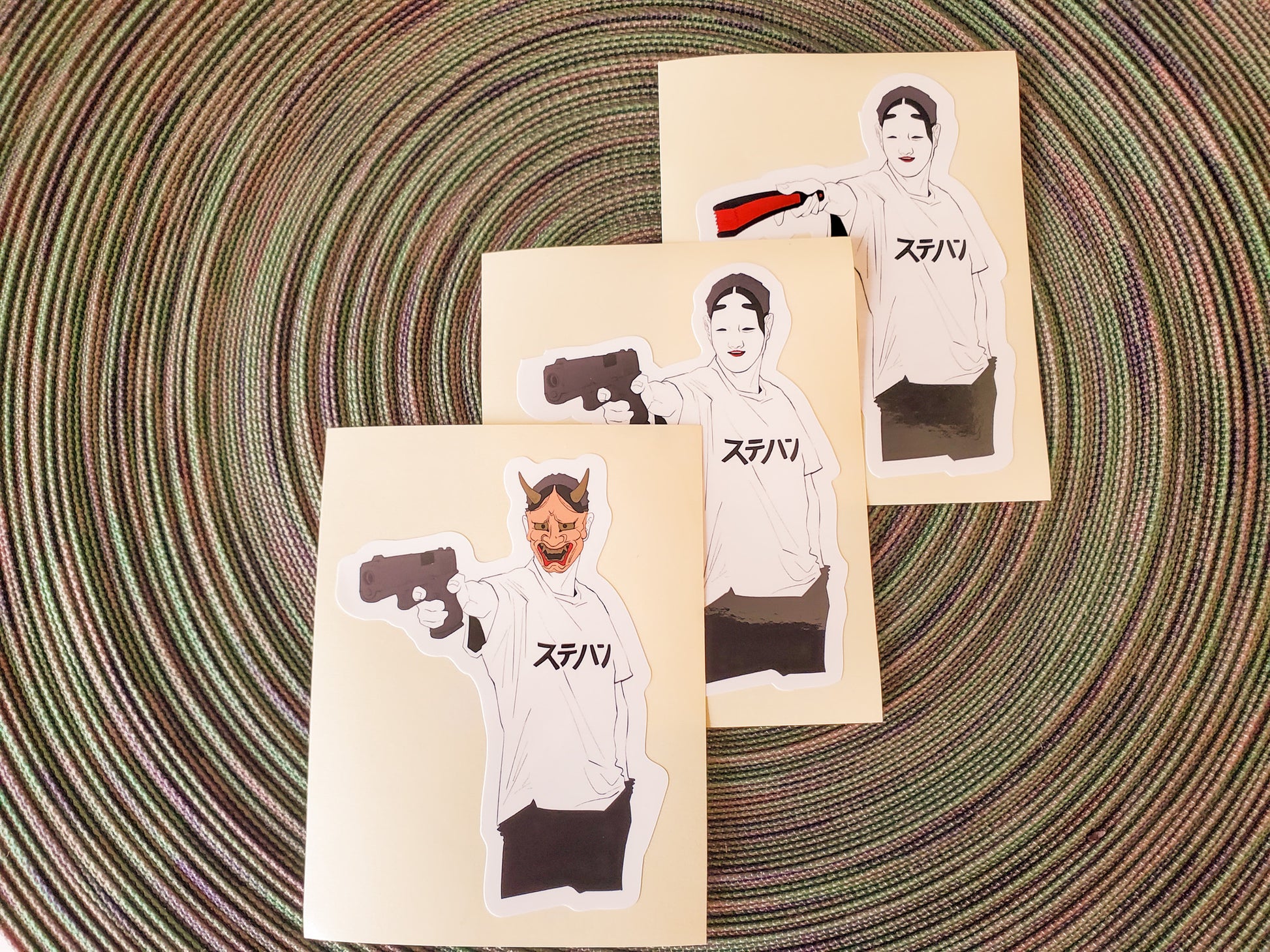 「小面の面に扇子」「小面の面に拳銃」「般若の面に拳銃」の3種類をセットにしました。