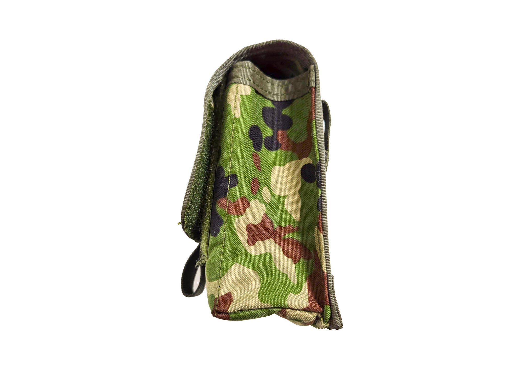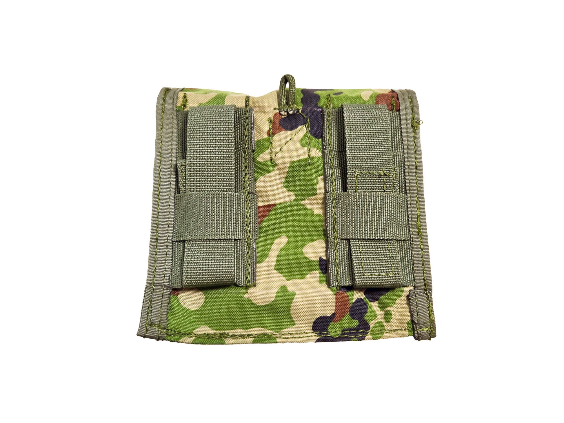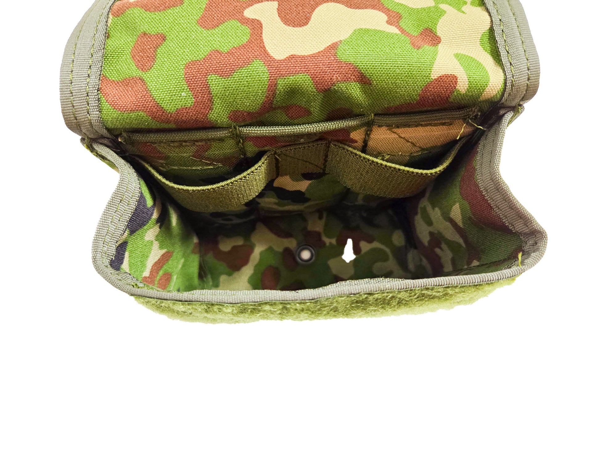 開閉はベルクロで行います。フラップの付け根には脱落防止用のパラコードを一線縫い付けていますので、紛失したくないものの保管にもおすすめです。また、内側にはエラスティックバンドも縫い付けていますので、中で暴れないように物を収納することも可能です。