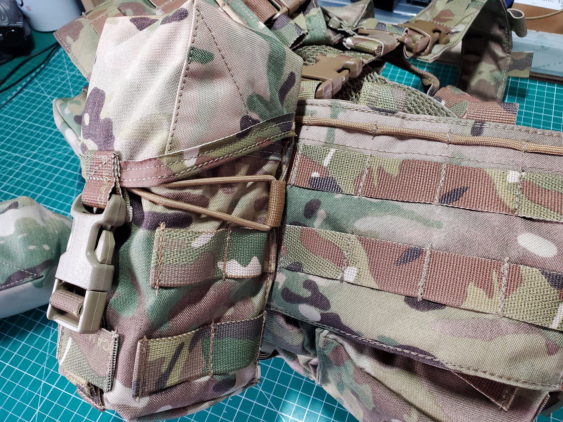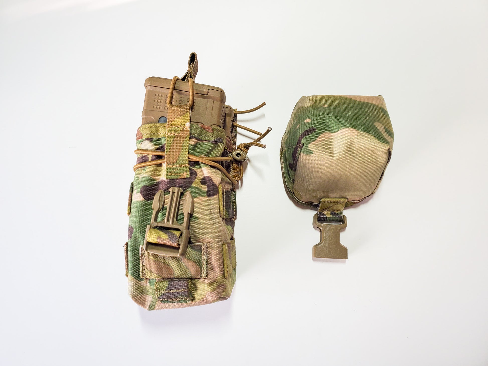 フラップは取り外すことができます。オープントップマグポーチの形状に変形できるので、塵芥防止が必要なくなった状況下において、有効です。背面の取り付け用ウェビングを、フラップに取り付けられたショックコードに通して装着すればフラップをすぐに取り付けることができます。