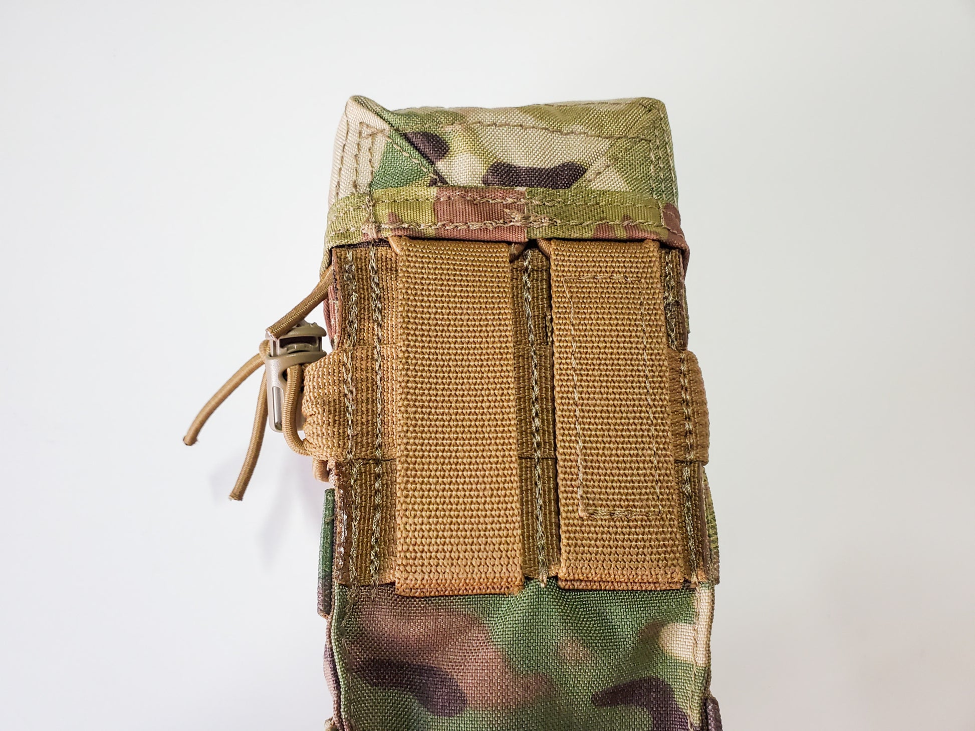 藪漕ぎをした際にポーチごとマガジンを紛失しないよう、ポーチ背面にはパラコードループを縫い付けております。また、左右に突き出たループを使えば、ショックコードで全体を縛着し、弾倉の騒音などを防げます。