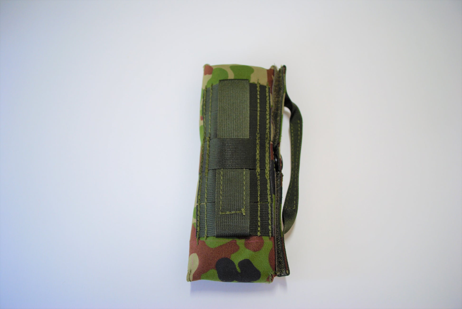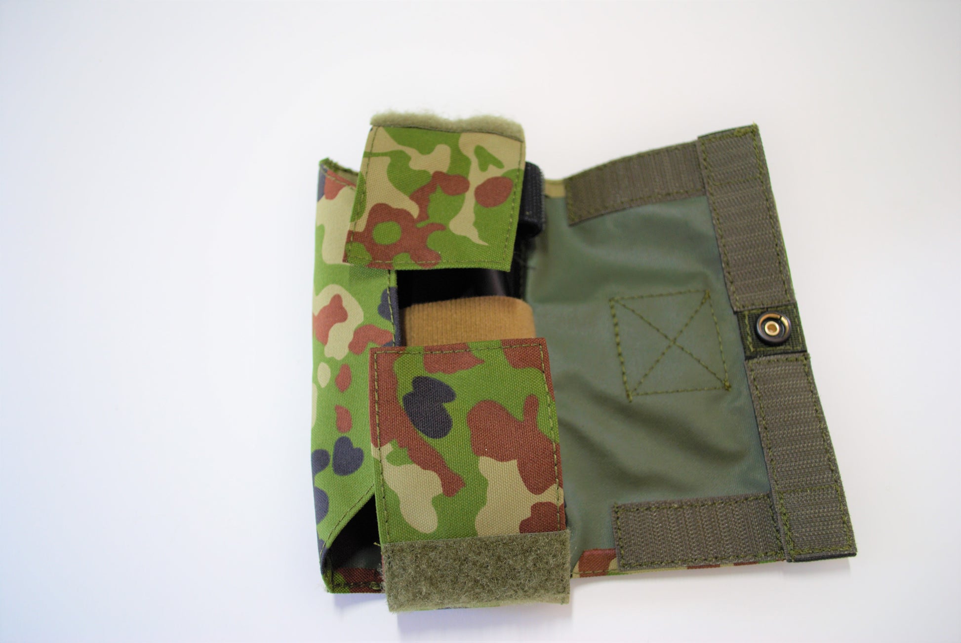 Stagehand Tacticalの個人用救急品袋構想におけるピースとして開発された止血帯用のポーチです。当製品は、体側左側に装着し、主に左腕で展開することを想定しています。