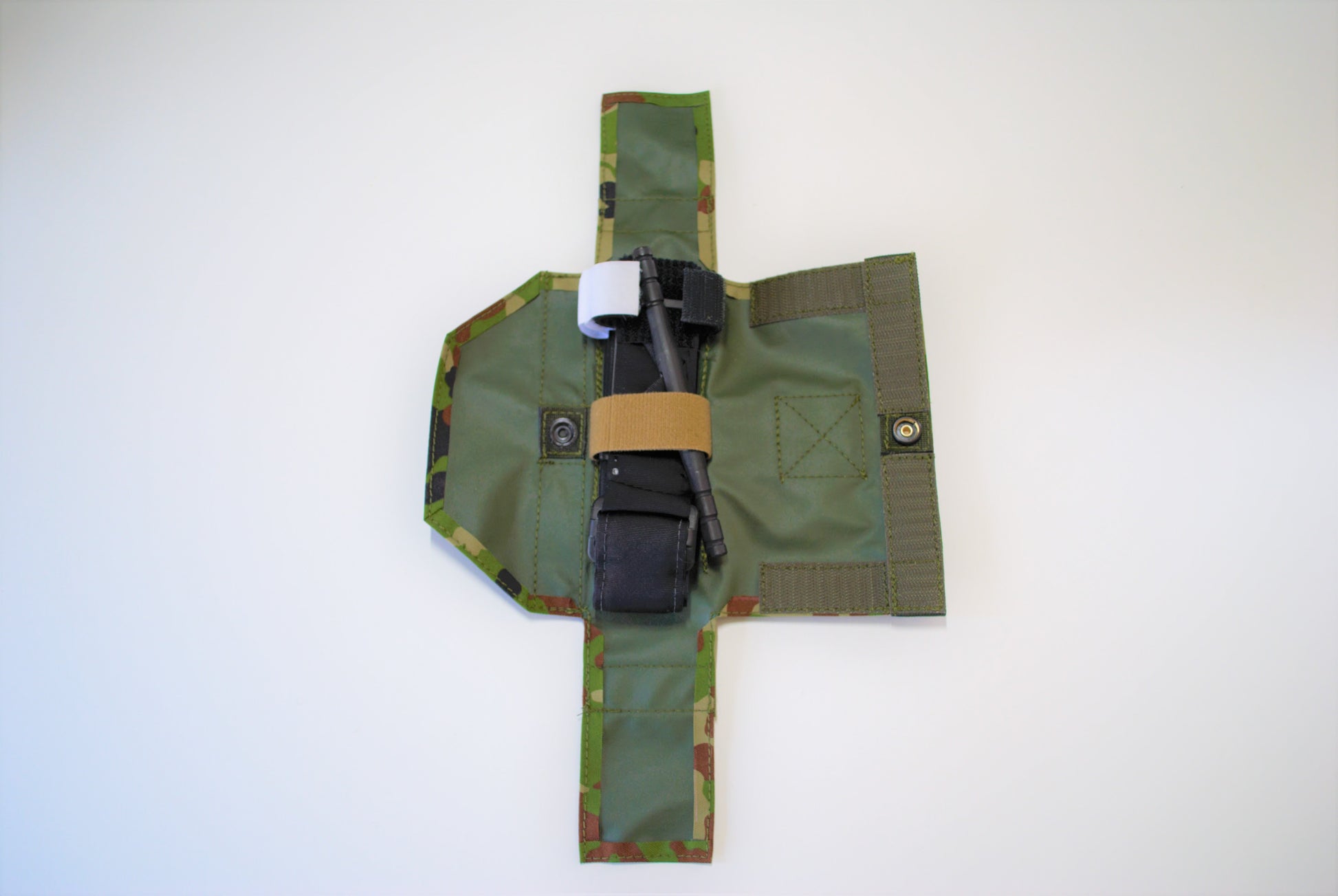 止血帯の保持は、One-Wrapベルクロを縫い付けるシンプルなものです。これは、止血帯を身体から離すように倒すことで簡単に取れるように保持したり、強固にガッチリ抱かせることで紛失することを防ぐようにも保持することができます。直感的に操作ができるほか、動作を演練したあと元に戻すのも極力簡単にできるようになっています。