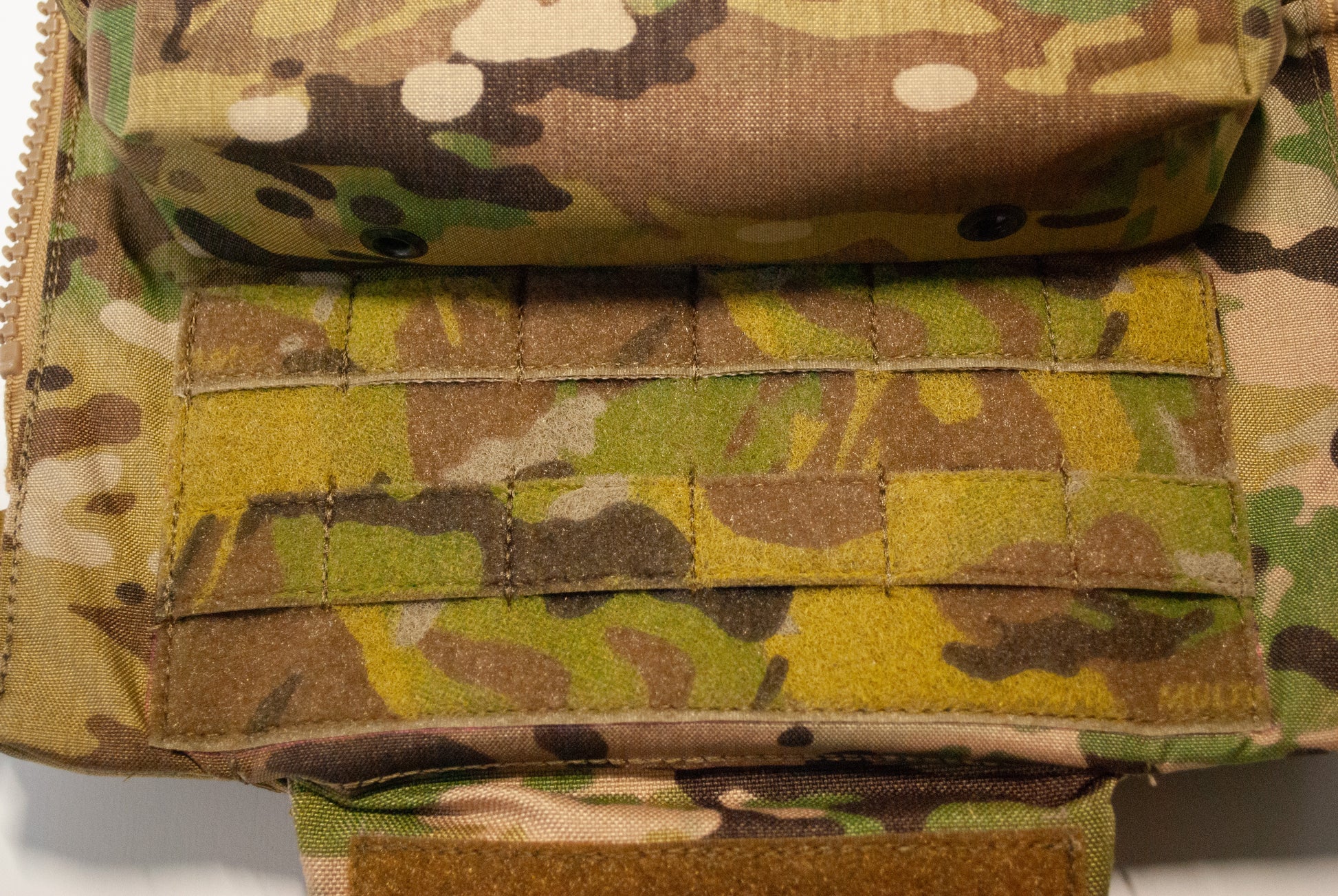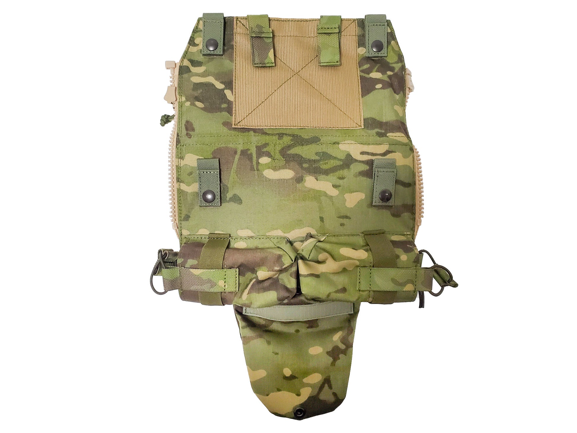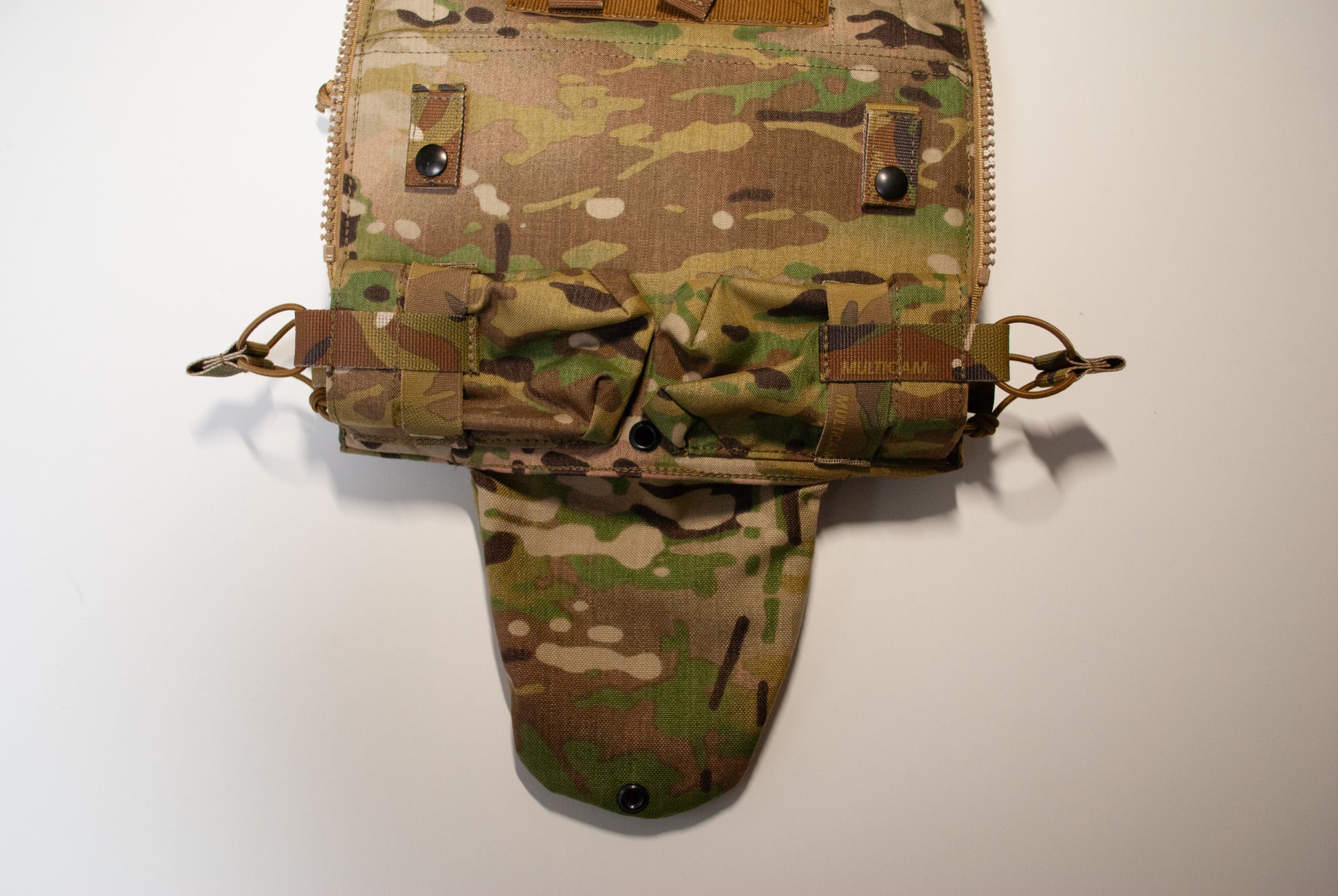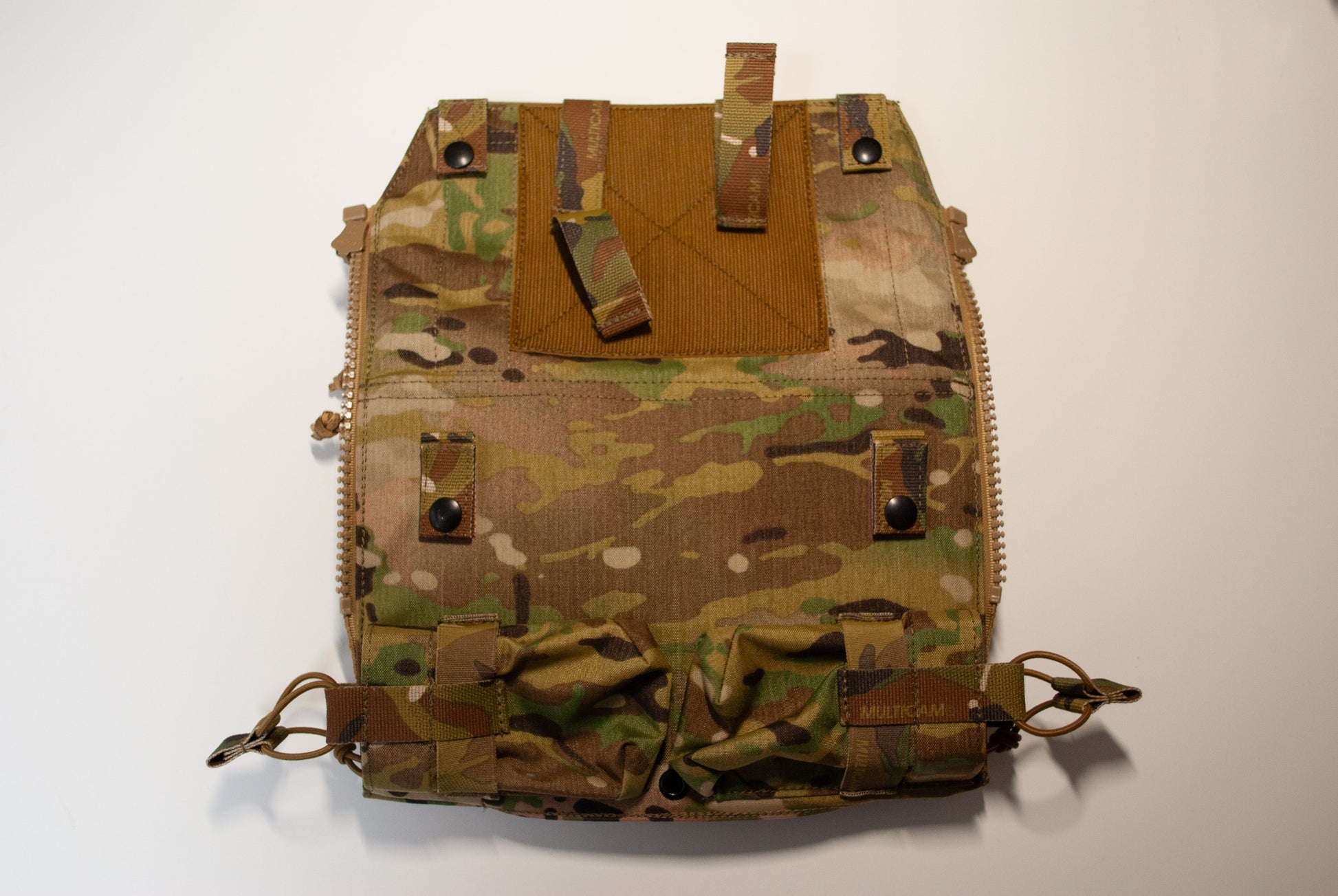 Crye Precision™製プレートキャリアに使用可能なバックパネルの、ポーチをひとつベルクロ付きMOLLE(2コマ×6コマ)に置き換えた物です。至極単純な理由ですが、StageHand Tactical代表が純正のバックパネルを見たときに「一番下のポーチ使わない」と感じたため、自由に他のポーチを付けられるようにしました。