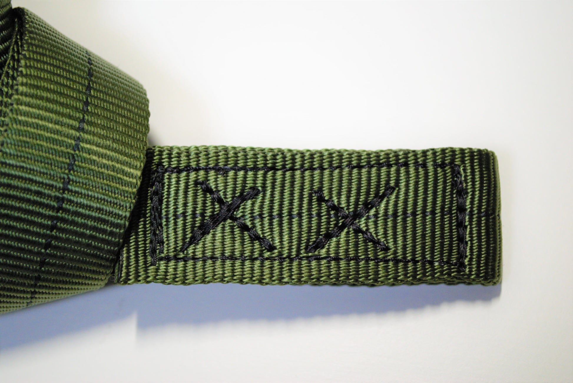 チューブラーウェビング(MIL-W-5625)は、破断強度が通常のウェビング(A-A-55301 T3)と比べて4倍あります。このチューブラーウェビングの端同士を、縦横斜めどの角度でも支えられる様、四角形にバツ印を2ついれる形で縫製しました。