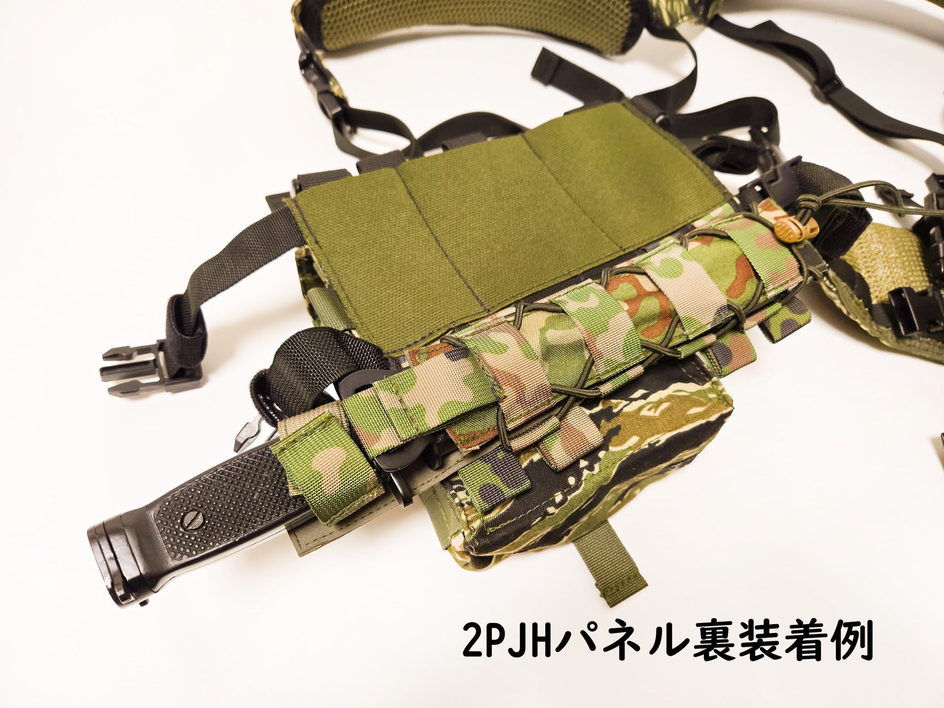 2PJHのパネルには裏側に0.75インチのウェビングが6コマ縫い付けてありますが、こちらに取り付けられるように作っております。