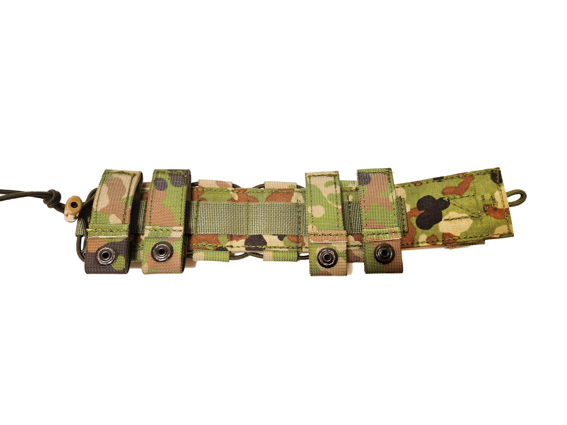 89式小銃用の銃剣鞘を確実に保持し、縦2~3コマのスペースに水平に取り付けるための保持具です。保持には、横6コマのMOLLEスペースが必要ですが、Stagehand Tacticalとしては珍しくスナップボタンを使った取り付け方法を選択したことで、0.75インチのウェビング(後述)に吊り下げるように使っても固定が可能になりました。